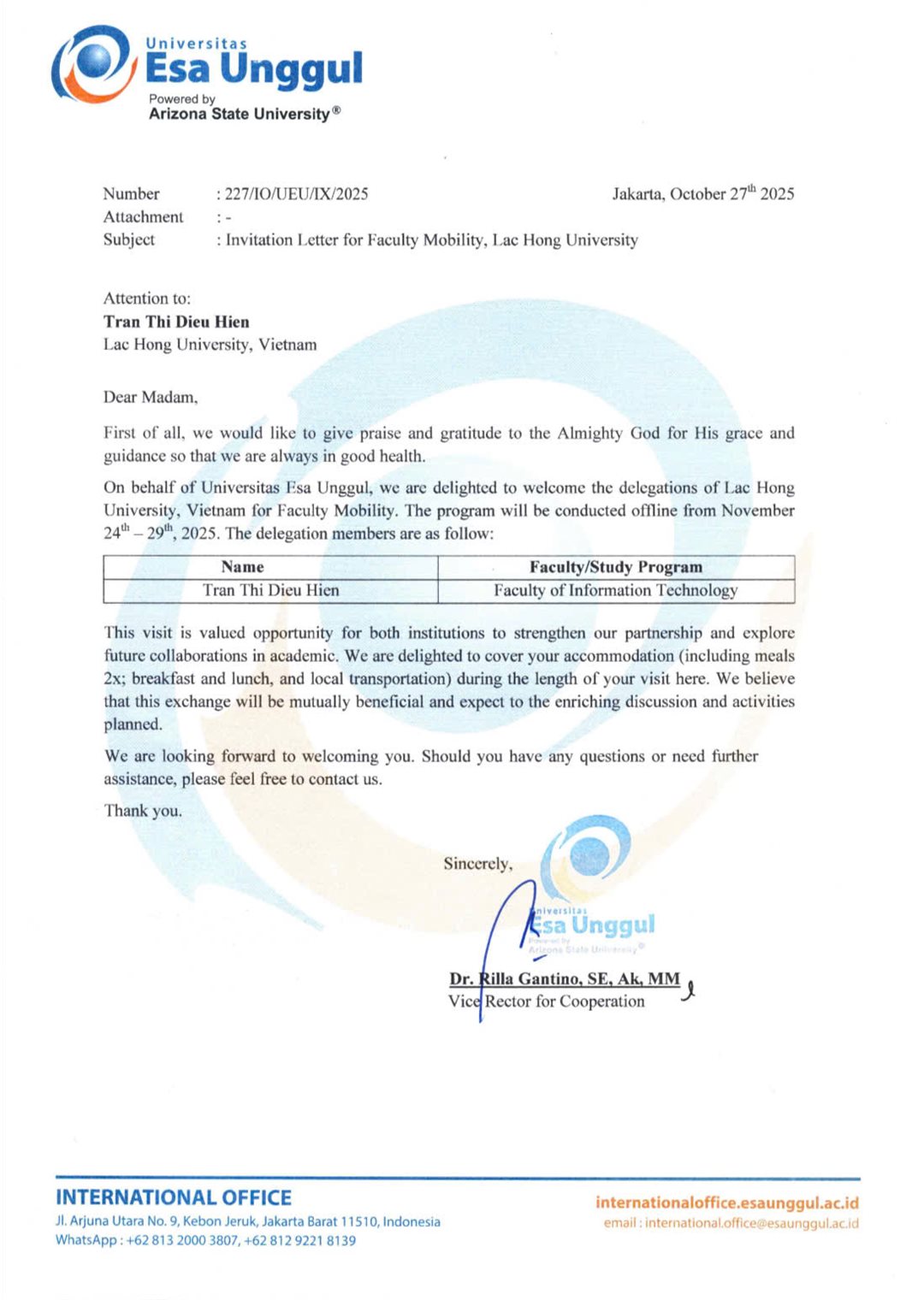 Trường Đại học Lạc Hồng tiếp tục ghi dấu ấn trên hành trình hội nhập quốc tế với tin vui từ Khoa Công nghệ Thông tin. Cô Trần Thị Diệu Hiền, giảng viên của khoa, đã được Trường ESA Unggul (Indonesia) chấp thuận hồ sơ và gửi lời mời tham gia chương trình Faculty Mobility. Đây là một trong những hoạt động hợp tác học thuật uy tín dành cho đội ngũ giảng viên các trường đại học toàn cầu.