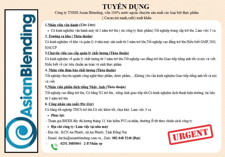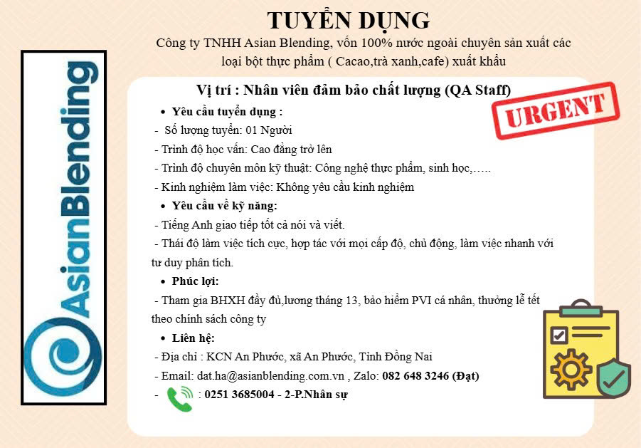 Công Ty TNHH Asian Blending thông báo tuyển dụng nhân viên QA, QC ngành thực phẩm...