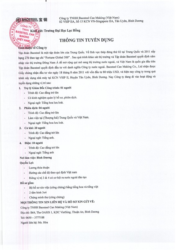 1. Công ty: TNHH Baosteel 2. Địa điểm làm việc: Bình Dương 3. Vị trí tuyển dụng: Vào đây xem chi tiết 4. Yêu cầu trình độ và kinh nghiệm: 5. Thời gian làm việc: 6. Mức lương: Thỏa thuận 7. Thời gian nhận hồ sơ: Từ 02/04/2012 đến 14/04/2012 8. Liên hệ: Trung tâm Quan hệ Doanh nghiệp & HTSV – Đại học Lạc Hồng (0613.951347 Cô Loan) Lưu ý: Sinh viên có thể liên hệ trực tiếp với công ty hoặc nộp HS tại Trung Tâm QHDN (không thu phí giới thiệu việc làm của người lao động)