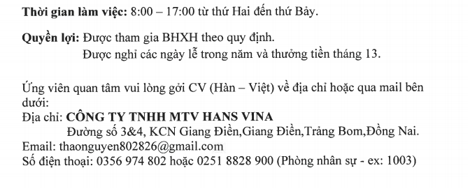 2. Nơi làm viêc: KCN Giang Điền, Trảng Bom, T. Đồng Nai