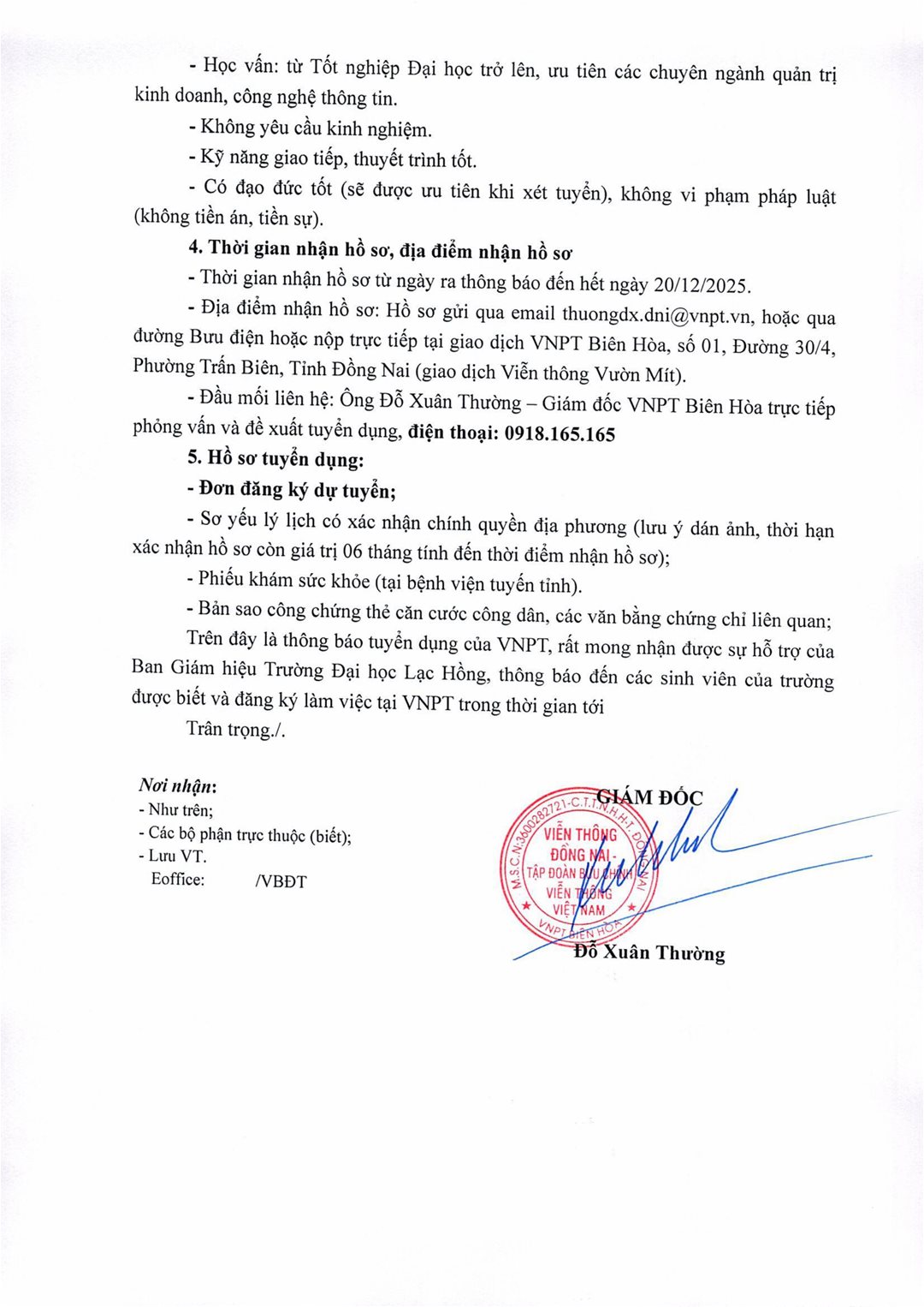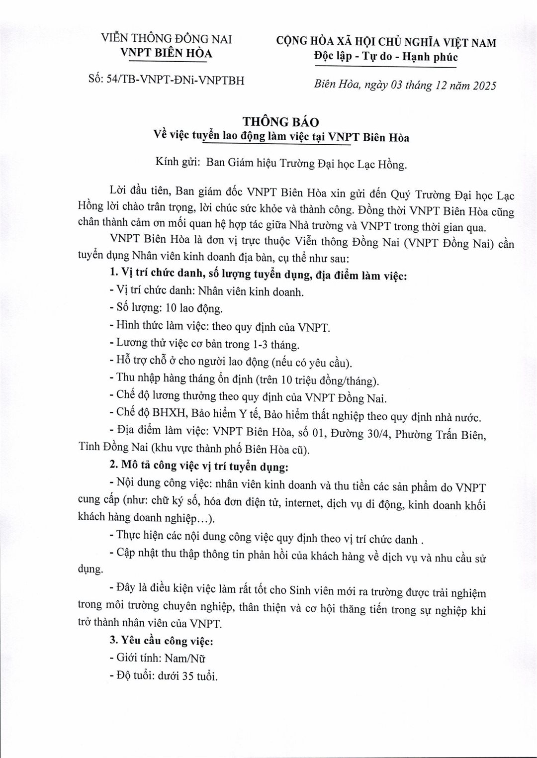 Thông báo tuyển dụng, việc làm toàn thời gian lần 55, năm học 2025-2026 (Viễn Thông Đồng Nai - VNPT Biên Hòa).