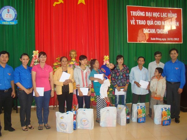 On Jan 16, Lac Hong University’s delegation including Secretary of the Youth Union Le Son Quang, Head of Department of Student Affairs Nguyen Ho Xuan Huong and some other comrades visited and presented Tet gifts totaling VND 24 million  for 20 AO/ dioxin victims in Cam My and Dinh Quan districts. Each gift included VND 1 million and a Tet gift worth VND 200, 000.