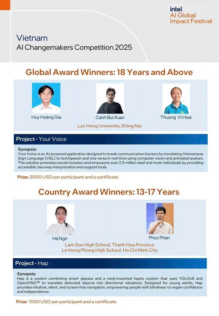 Ngày 13/10/2025, Khoa Công nghệ Thông tin của Đại học Lạc Hồng (LHU) đã ghi dấu một cột mốc quốc tế quan trọng khi đội sinh viên LHU – bao gồm các bạn Hoàng Gia Huy, Bùi Xuân Cảnh và Vi Hoài Thương – được vinh danh Giải Toàn cầu (Global Award) tại Intel AI Global Impact Festival 2025 với dự án Your Voice. Đây là một trong hai nhóm duy nhất từ Việt Nam đạt giải ở hạng mục toàn cầu, mở rộng bước chân của sinh viên Việt Nam trên bản đồ đổi mới sáng tạo quốc tế.